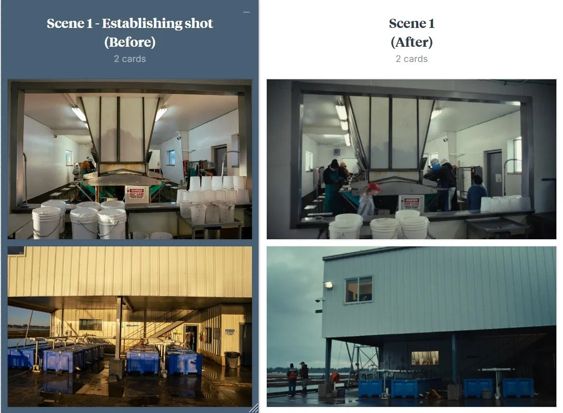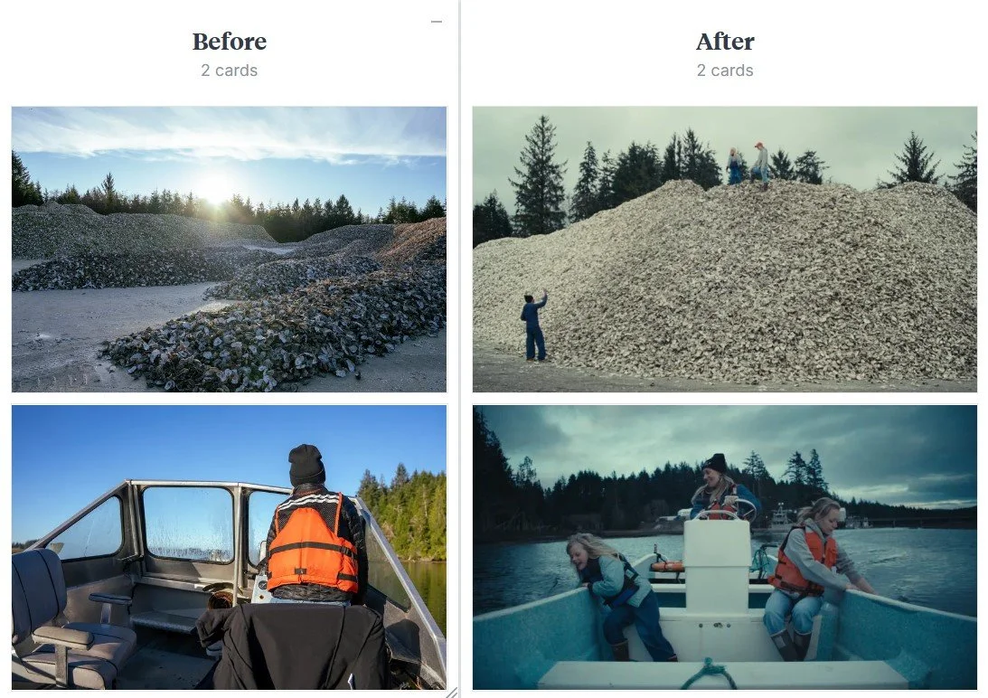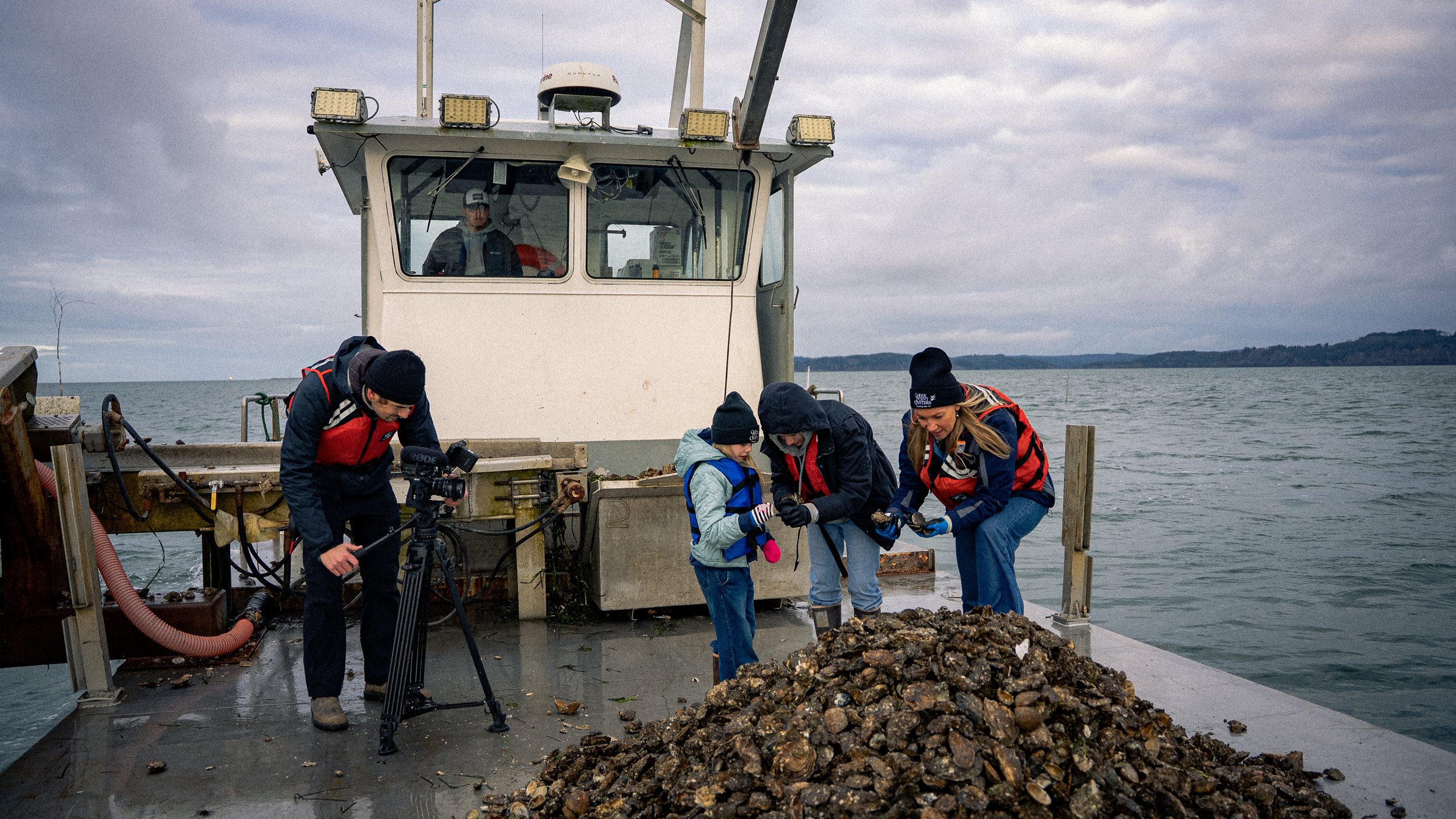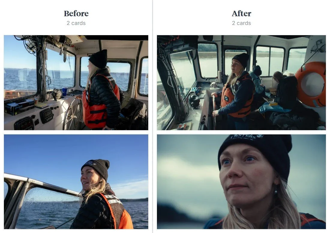 Certain moments during the shoot required precise setup to capture key parts of the oyster operation. These shots often involved rigging gear or coordinating specific actions, which meant clear communication and planning with Kathleen and her team was essential. Factors like weather added another layer of complexity, and in some cases we needed machinery or lighting activated at just the right time. Flagging these needs early in the day helped everyone stay aligned and kept the production moving efficiently.